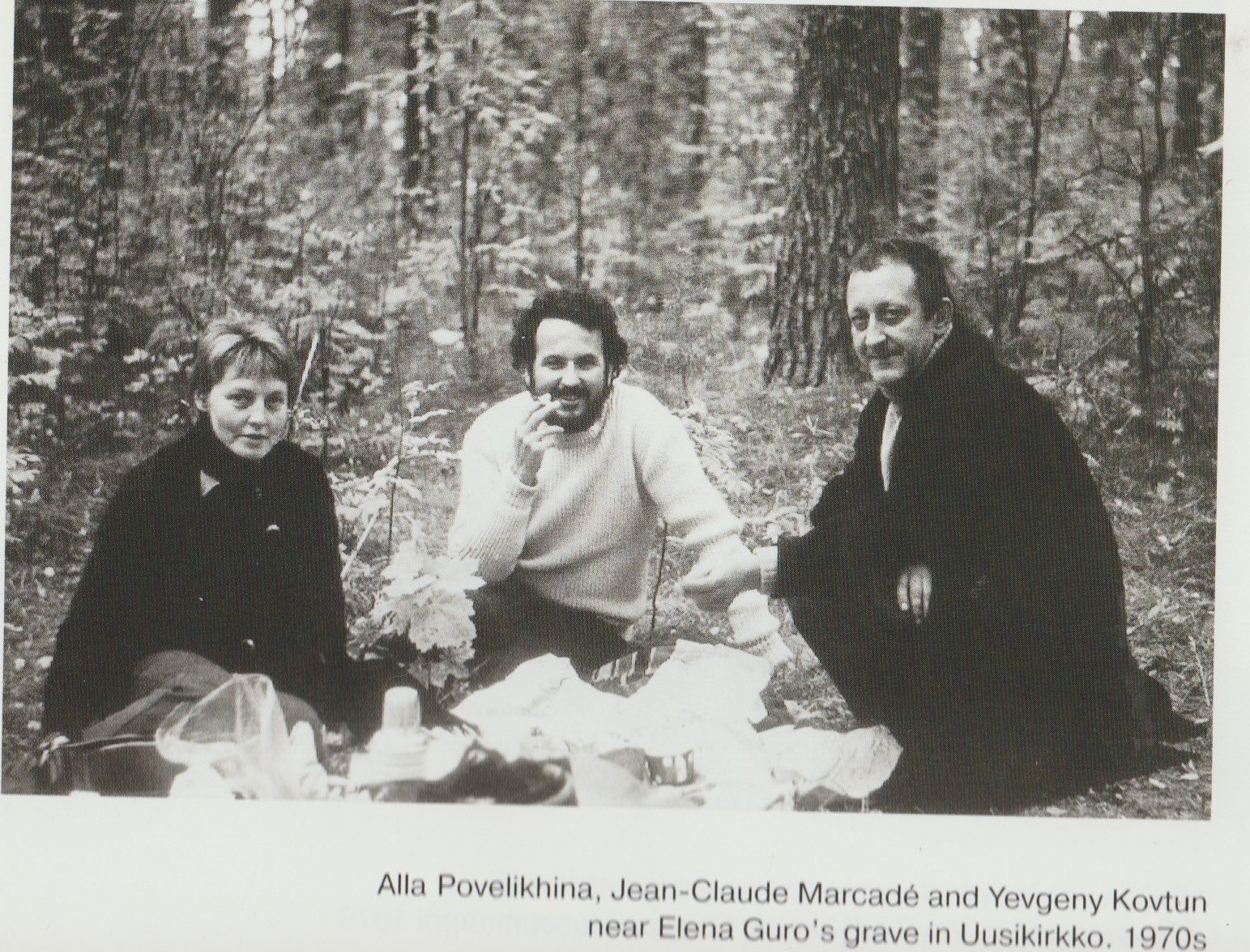 ALLA PAVÉLIKHINA, JEAN-CLAUDE MARCADÉ, EVGUÉNI KOVTOUNE DANS LA FORÊT FINNOISE D’UUSIKIRKKO PRÈS DE LA TOMBE D’ÉLÉNA GOURAUD, POETE ET PEINTRE RUSSE MoRTE EN 1913, années 1970 SERGUEÏ DÉDIOULINE (1950-2025), JOURNALISTE SPÉCIALISTE , EN PARTICULIER, DE LA LITTÉRATURE RUSSE ET DES ARTS