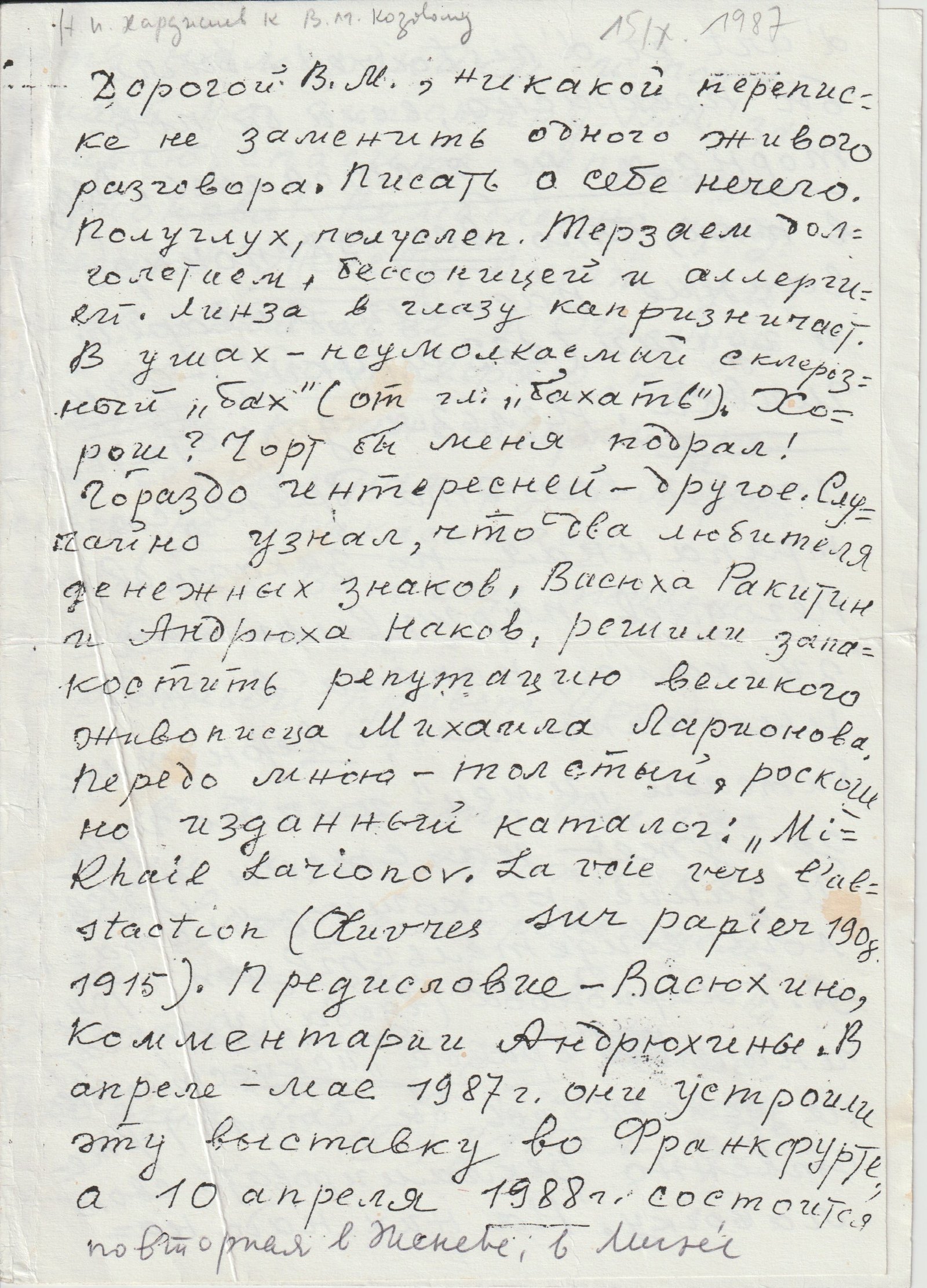 « Rossiné (un jeune peintre russe), qui travaille la théorie de la peinture et tout spécialement des partitions musicales, veut absolument faire ta connaissance. Lui-même est fantastique. Peut-être qu’il viendra encore une fois à Munich en septembre, autrement il te demande de venir en Suisse (à Weggis près de Lucerne – il y a un centre de la Suisse qui peint : “Moderner Bund” » (Lettre de V. V. Kandinskij à F. A. Gartman du 2O.VIII. 1912, Archives nationales de Russie [RGALI], Moscou).