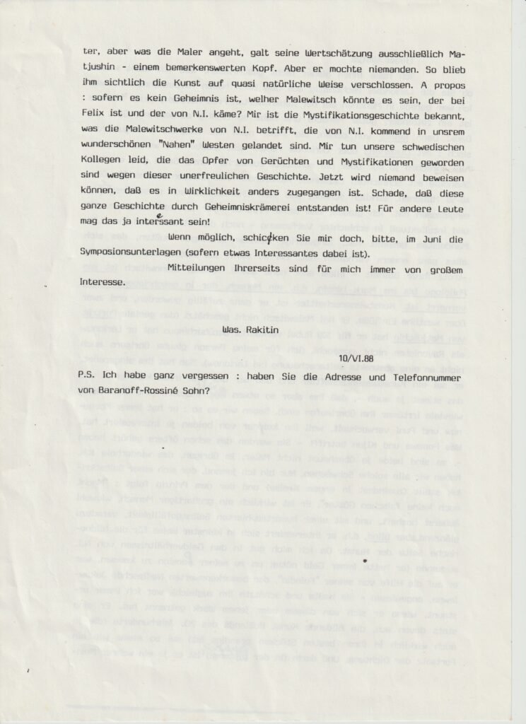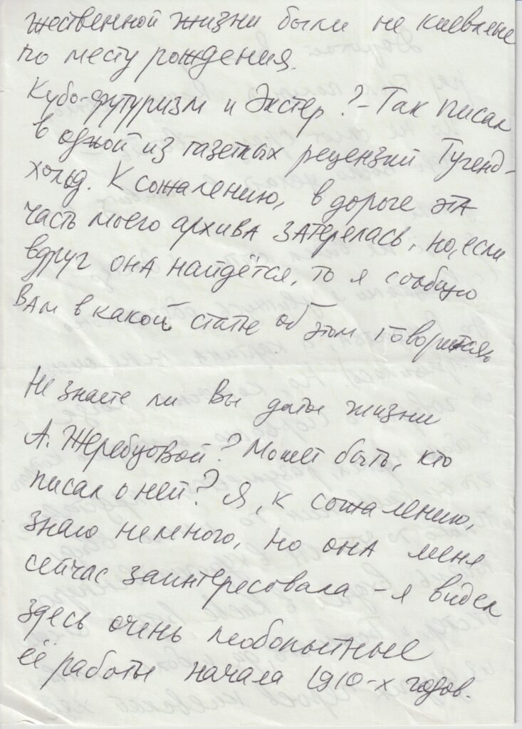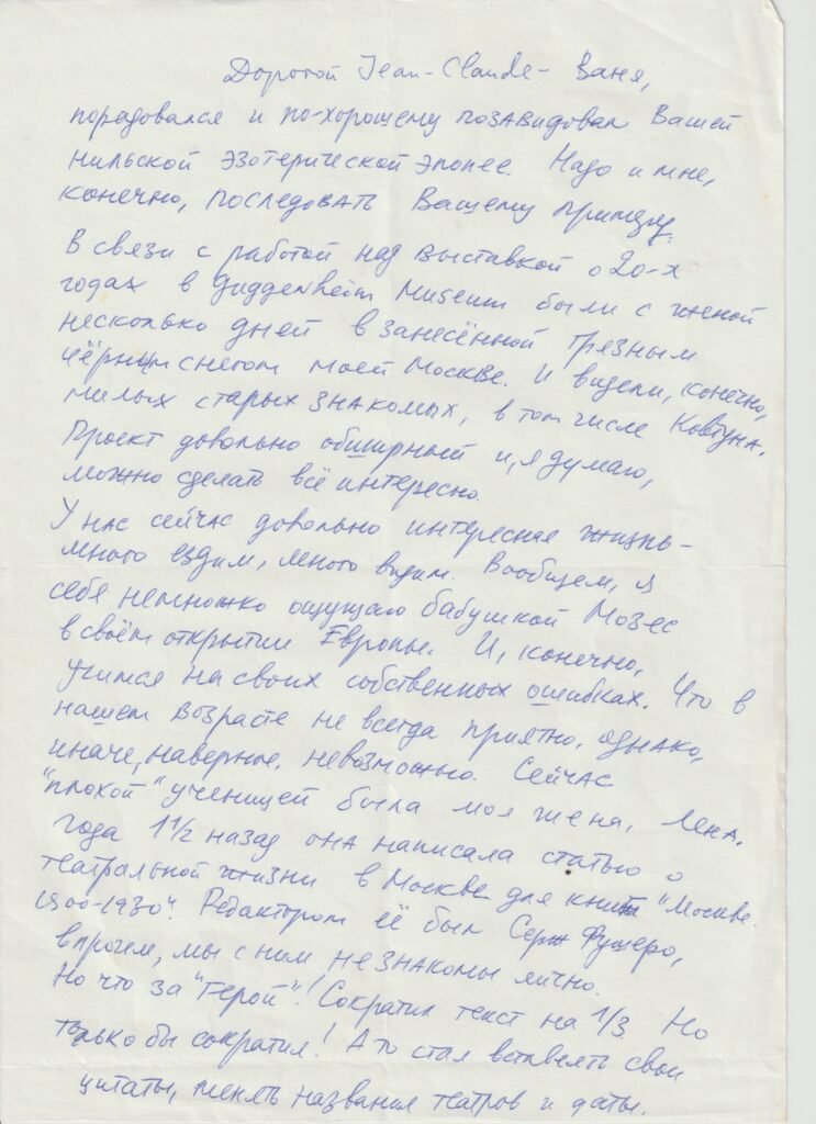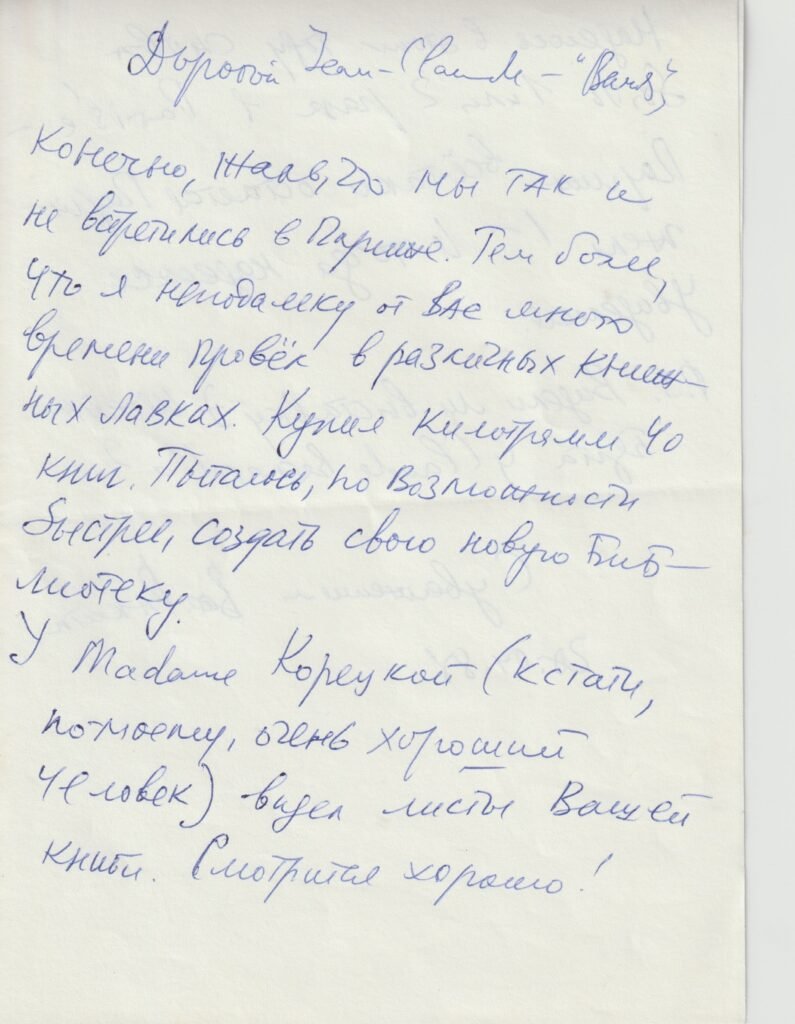 Quand ma femme Valentine, née elle aussi à Odessa, l’a rencontrée en ma compagnie vers le milieu des années 1960, il n’y eut aucune conversation à ce sujet. Elle a plutôt été désagréable, car ayant donné à voir à Valentine le texte russe La peinture contemporaine publié à Berlin, elle le lui a violemment enlevé de ses mains quand Valentine a voulu noter des passages de ce livre…
