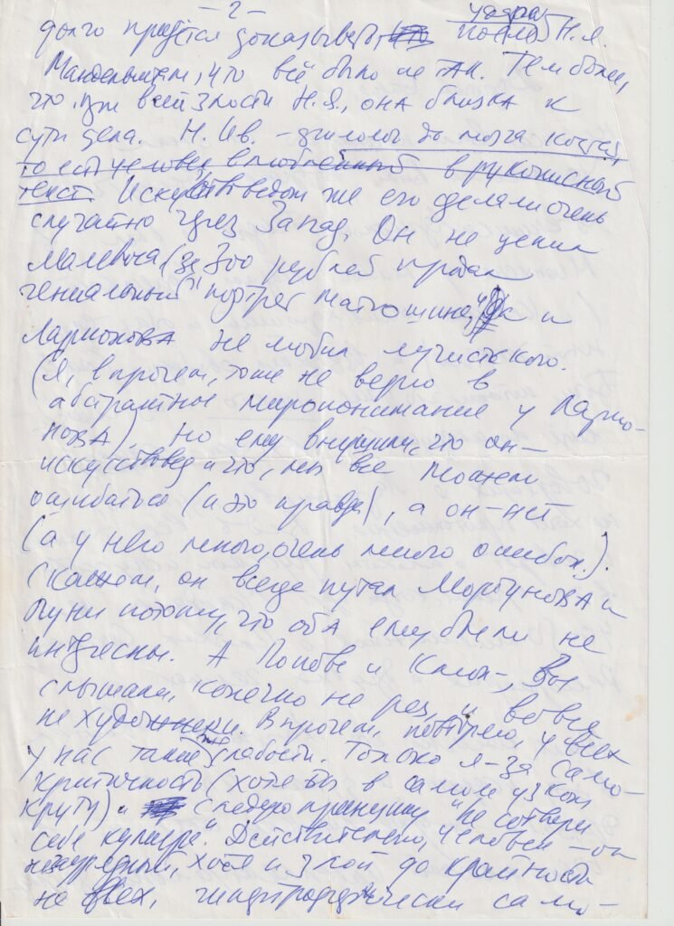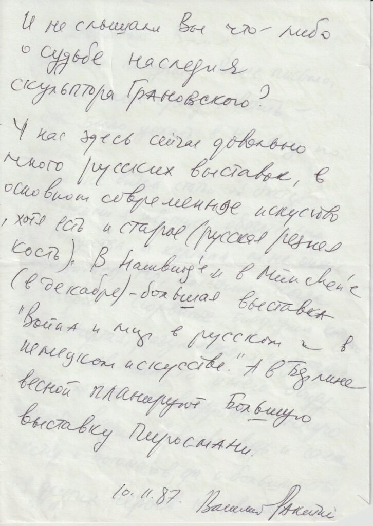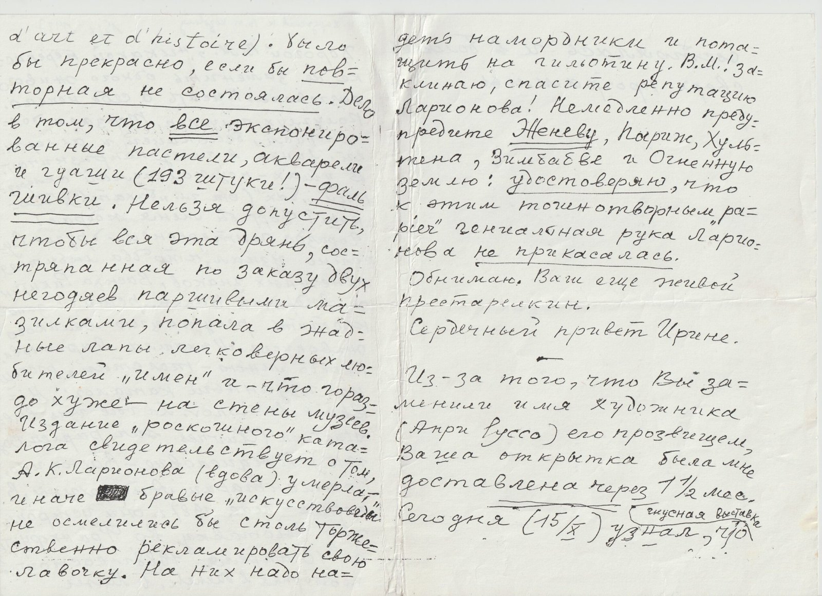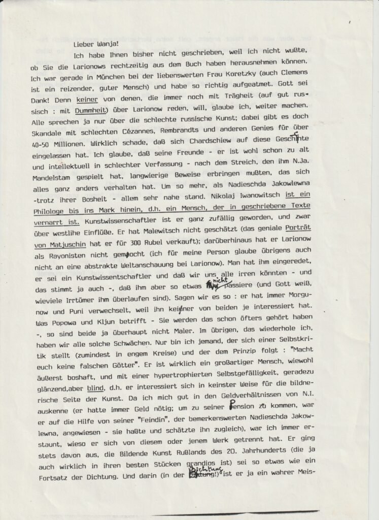 Quand ma femme Valentine, née elle aussi à Odessa, l’a rencontrée en ma compagnie vers le milieu des années 1960, il n’y eut aucune conversation à ce sujet. Elle a plutôt été désagréable, car ayant donné à voir à Valentine le texte russe La peinture contemporaine publié à Berlin, elle le lui a violemment enlevé de ses mains quand Valentine a voulu noter des passages de ce livre…