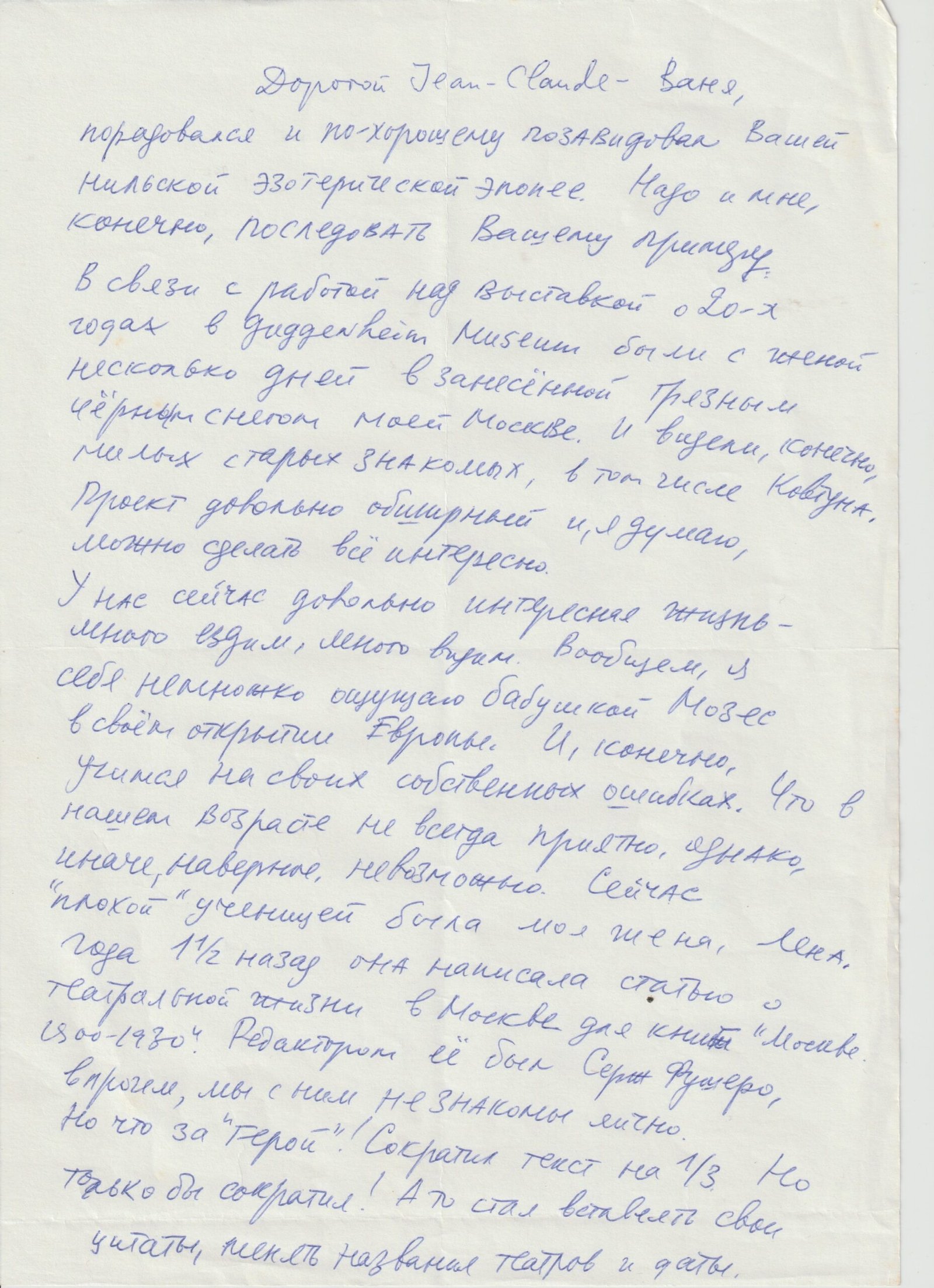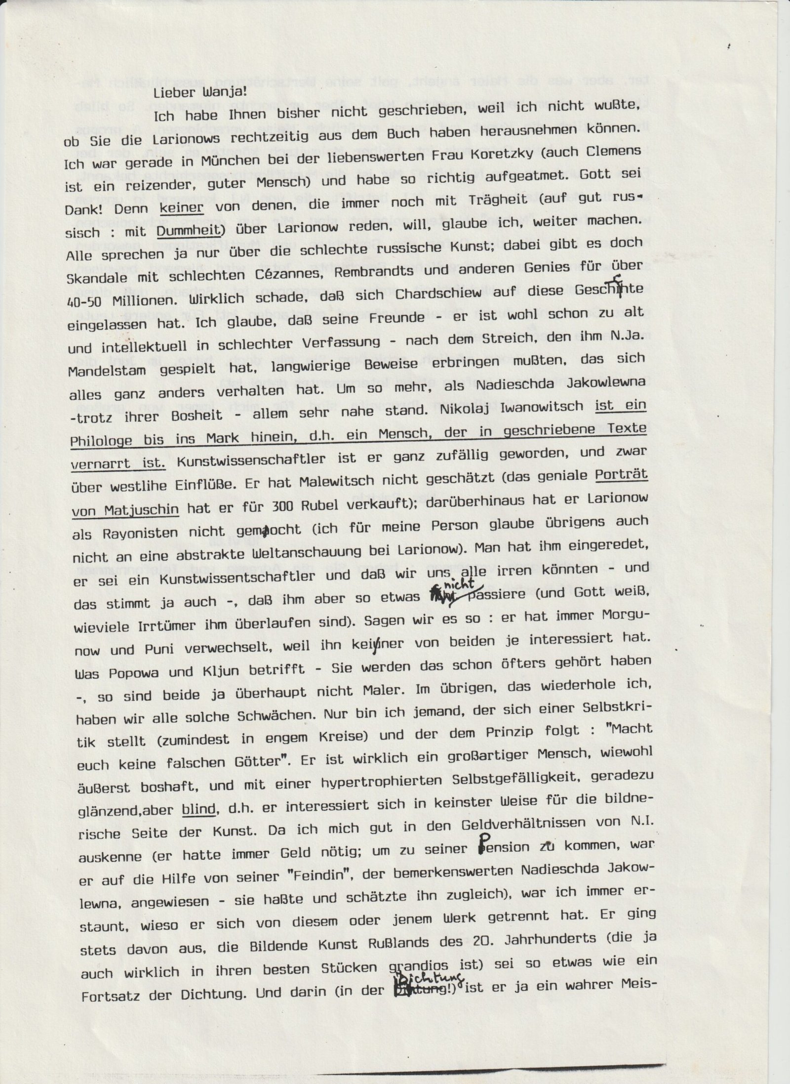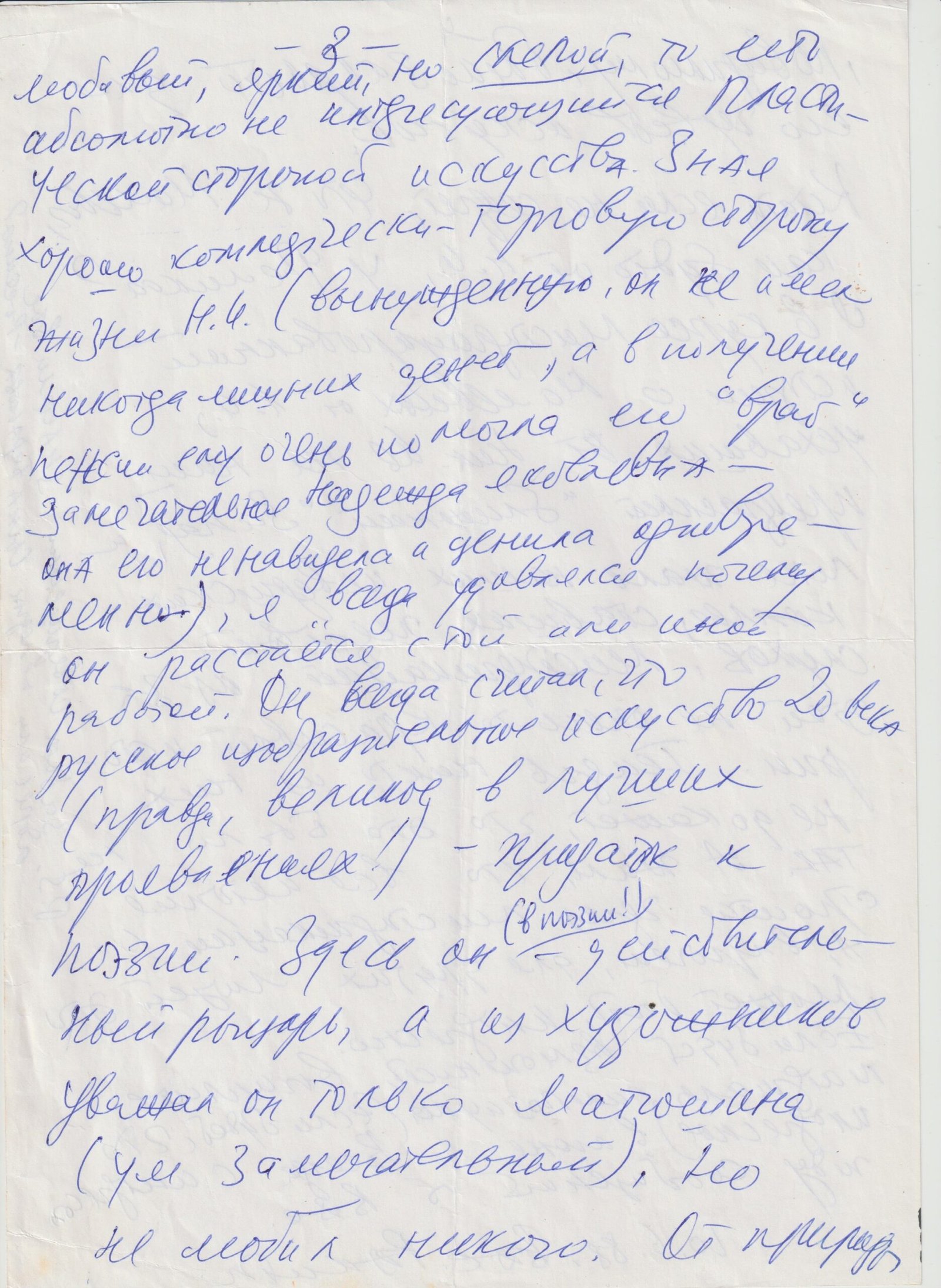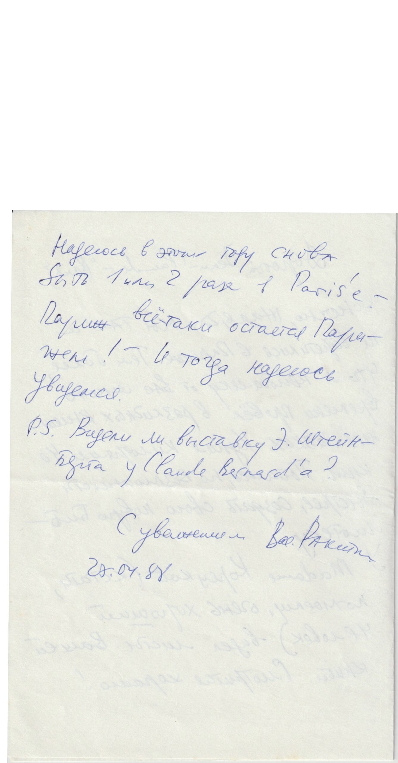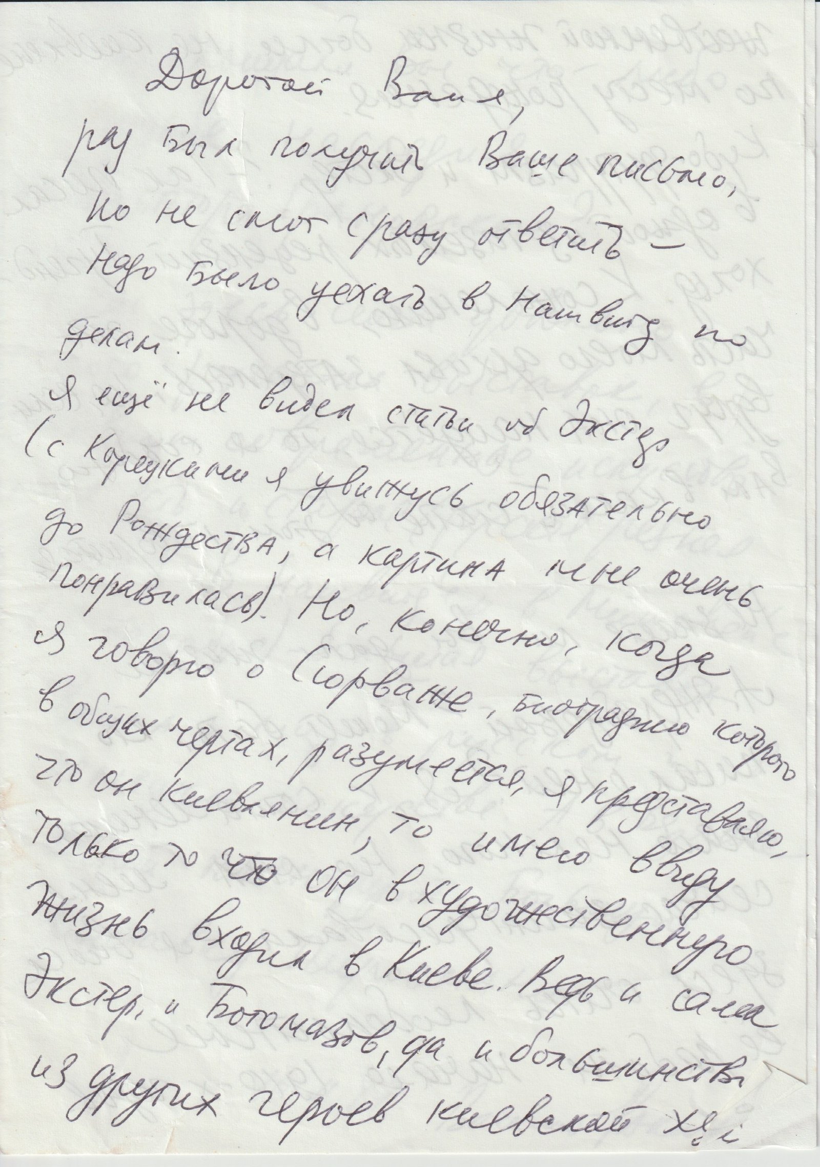 Quand ma femme Valentine, née elle aussi à Odessa, l’a rencontrée en ma compagnie vers le milieu des années 1960, il n’y eut aucune conversation à ce sujet. Elle a plutôt été désagréable, car ayant donné à voir à Valentine le texte russe La peinture contemporaine publié à Berlin, elle le lui a violemment enlevé de ses mains quand Valentine a voulu noter des passages de ce livre…