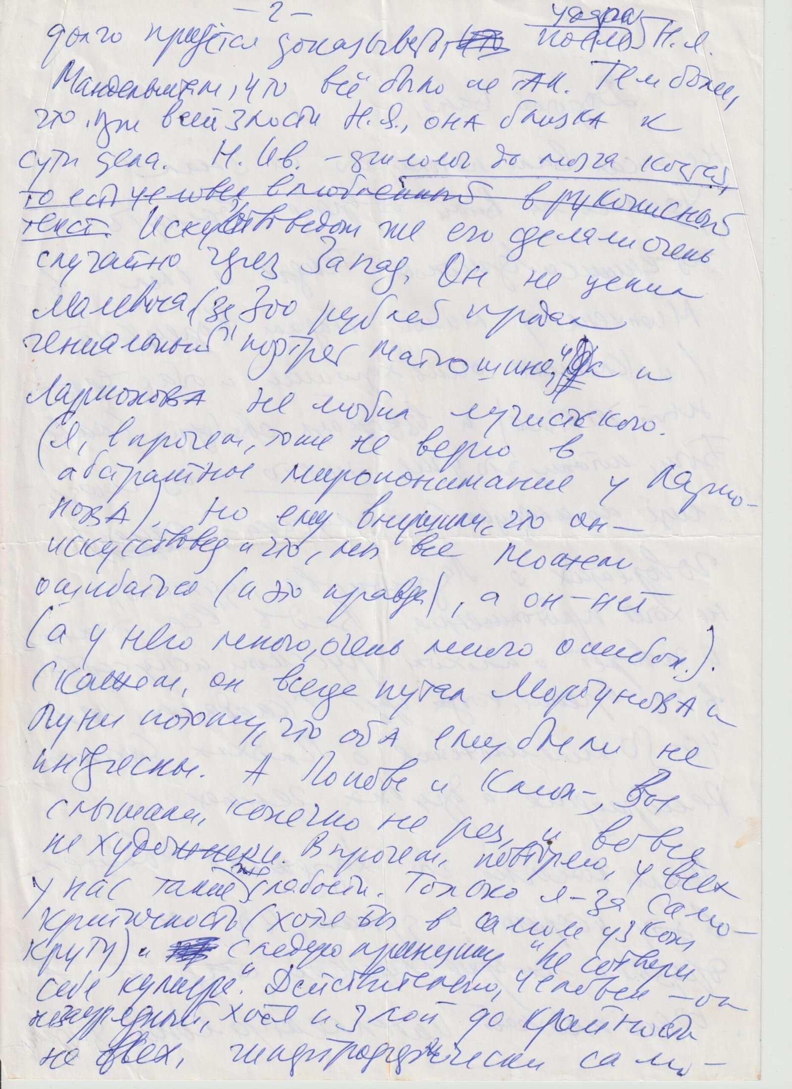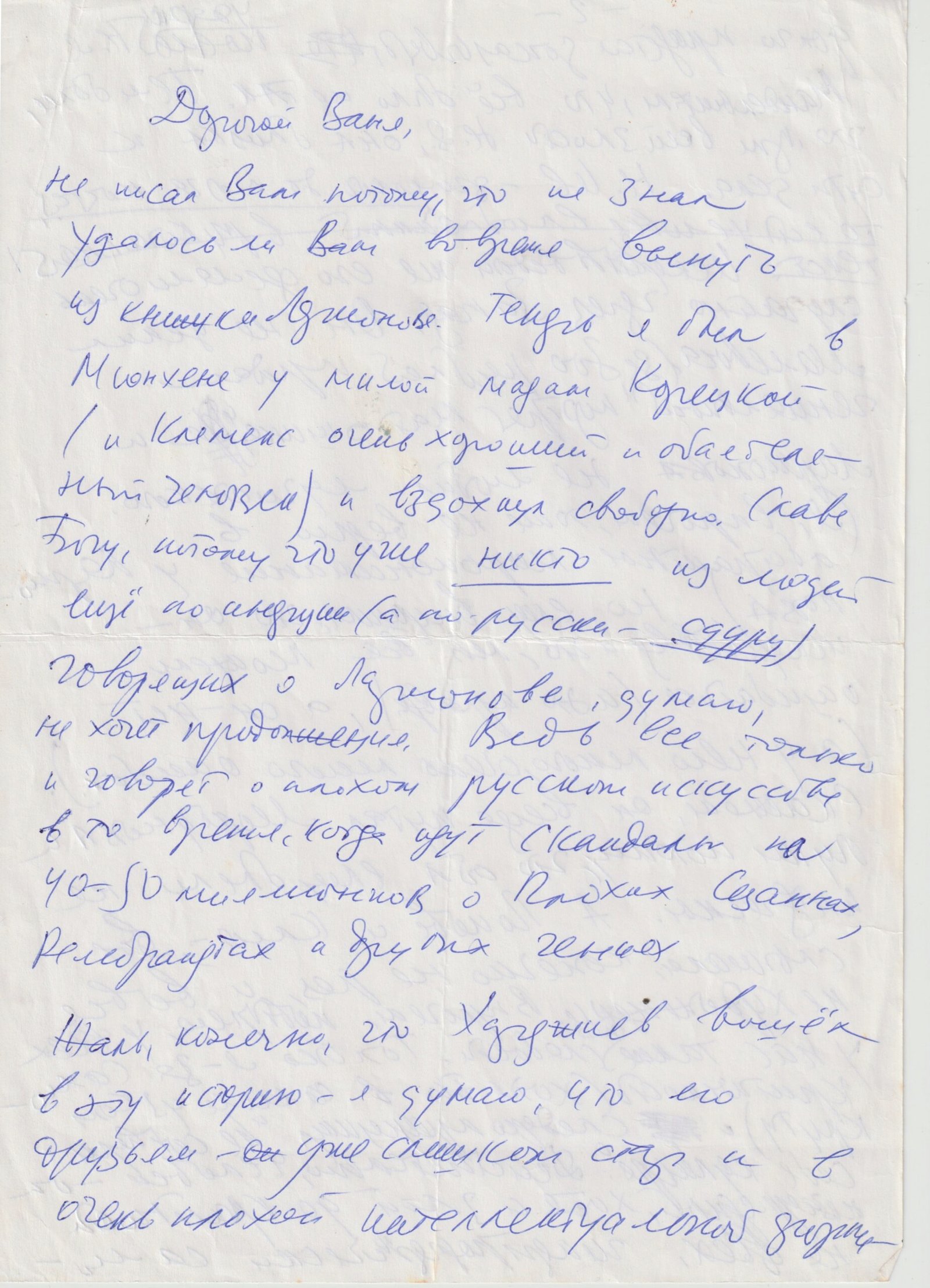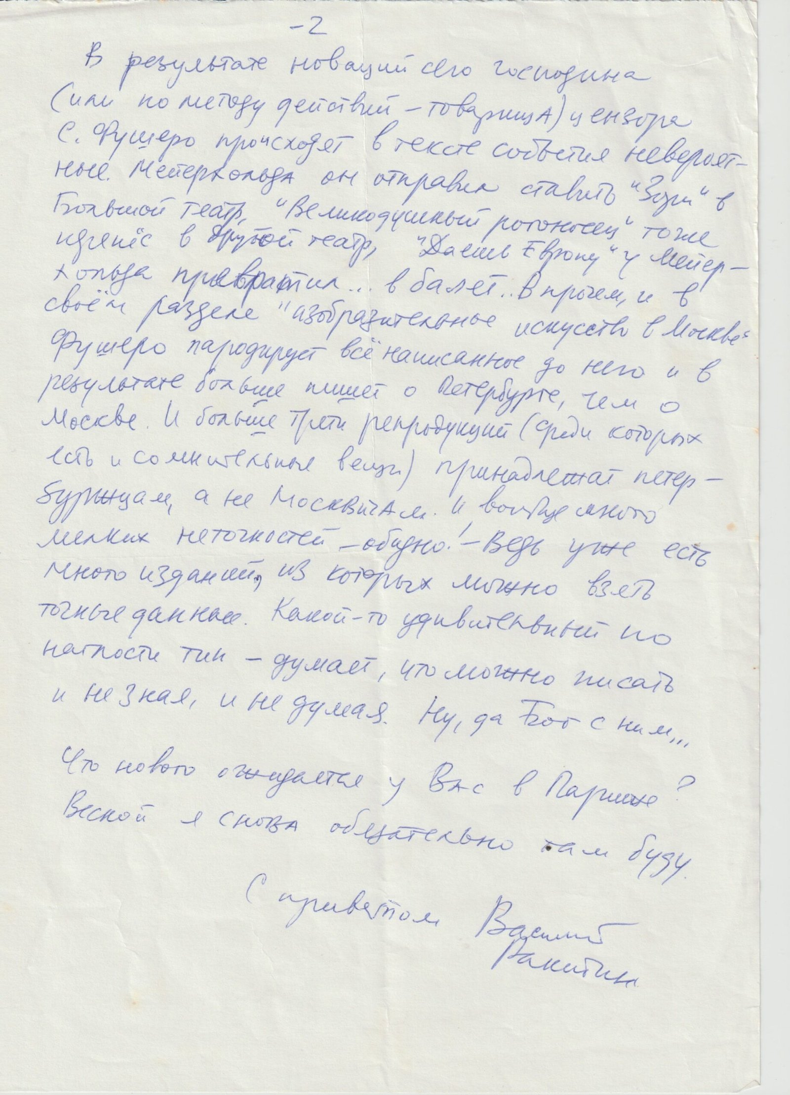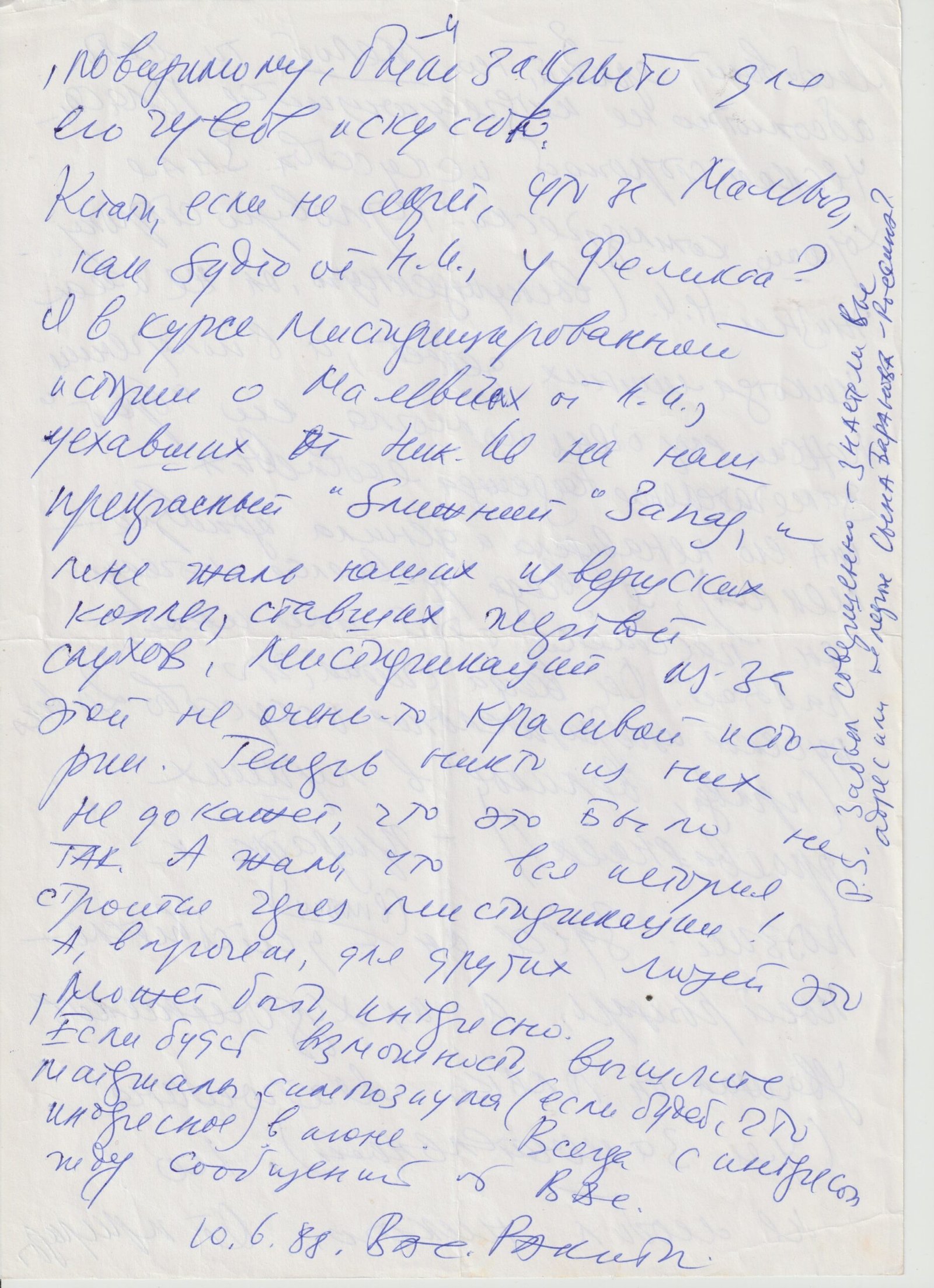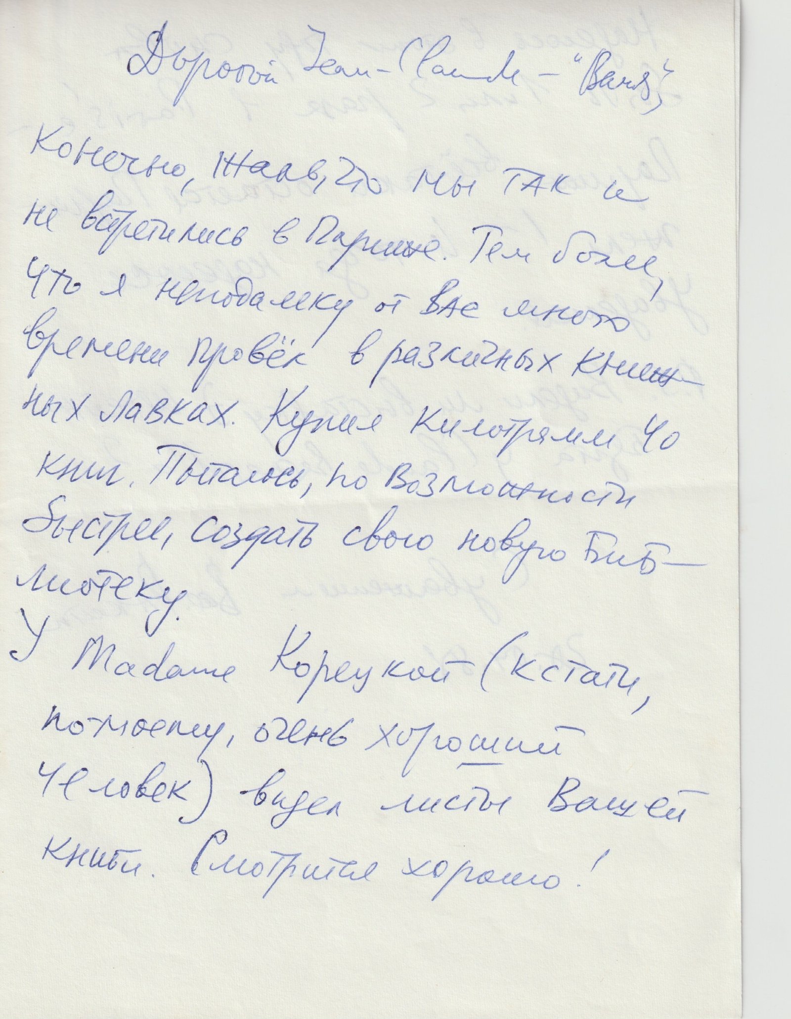 Quand ma femme Valentine, née elle aussi à Odessa, l’a rencontrée en ma compagnie vers le milieu des années 1960, il n’y eut aucune conversation à ce sujet. Elle a plutôt été désagréable, car ayant donné à voir à Valentine le texte russe La peinture contemporaine publié à Berlin, elle le lui a violemment enlevé de ses mains quand Valentine a voulu noter des passages de ce livre…