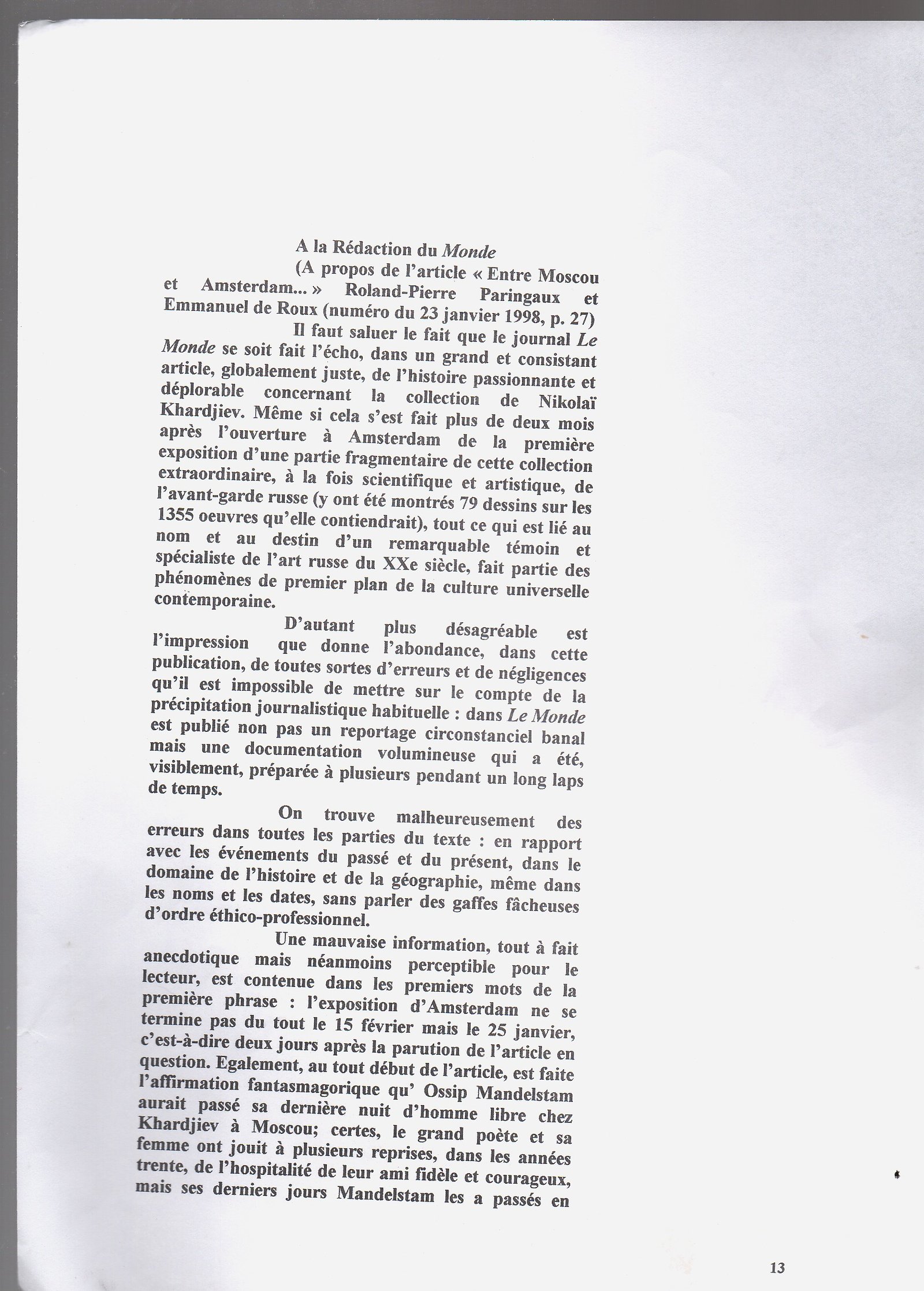 En mettant en ordre mes archives, j’ai retrouvé tout un dossier et ce tapuscrit du journaliste Dédiouline sur l’affaire de l’exil au début des années 1990 du grand historien de l’art soviétique Nikolaï Khardjiev à Amsterdam avec une partie de ses archives dont de nombreux tableaux de l’avant-garde russe et soviétique qui ont enrichi les collections du Stedelijk Museum amstellodamois . Il suffit de lire aujourd’hui les papiers de M. Vitkine et consorts sur les pays se trouvant à l’Est de l’Europe qui sont écrits impunément selon une gille de lecture a priori apodictique…