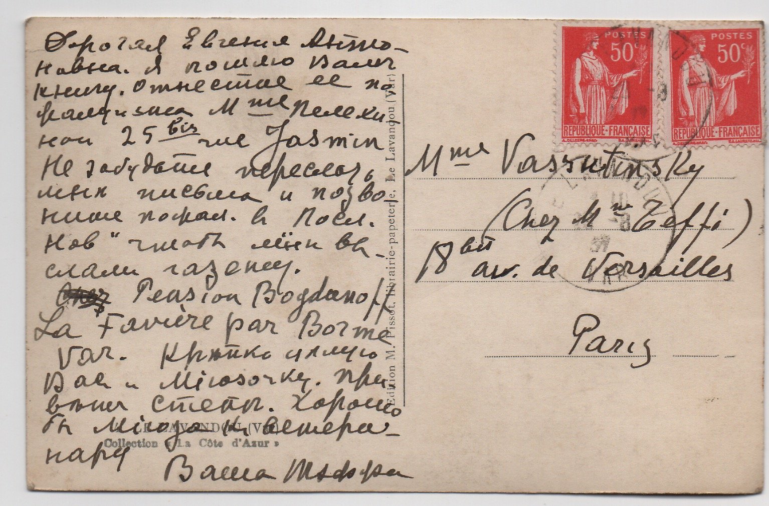 LETTRE DE L’ÉCRIVAINE NADIEJDA TEFFI À EVGUÉNIYA ANTONOVNA WASUTINSKA (NÉE KORBÉ) QUI FAISAIT OFFICE DE DAME DE COMPAGNIE